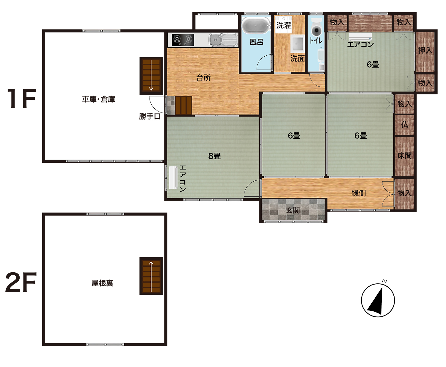 1階 和室6畳×3、和室8畳、トイレ、風呂、台所 2階 屋根裏部屋 |